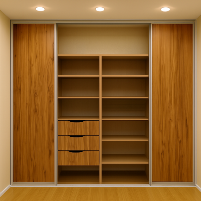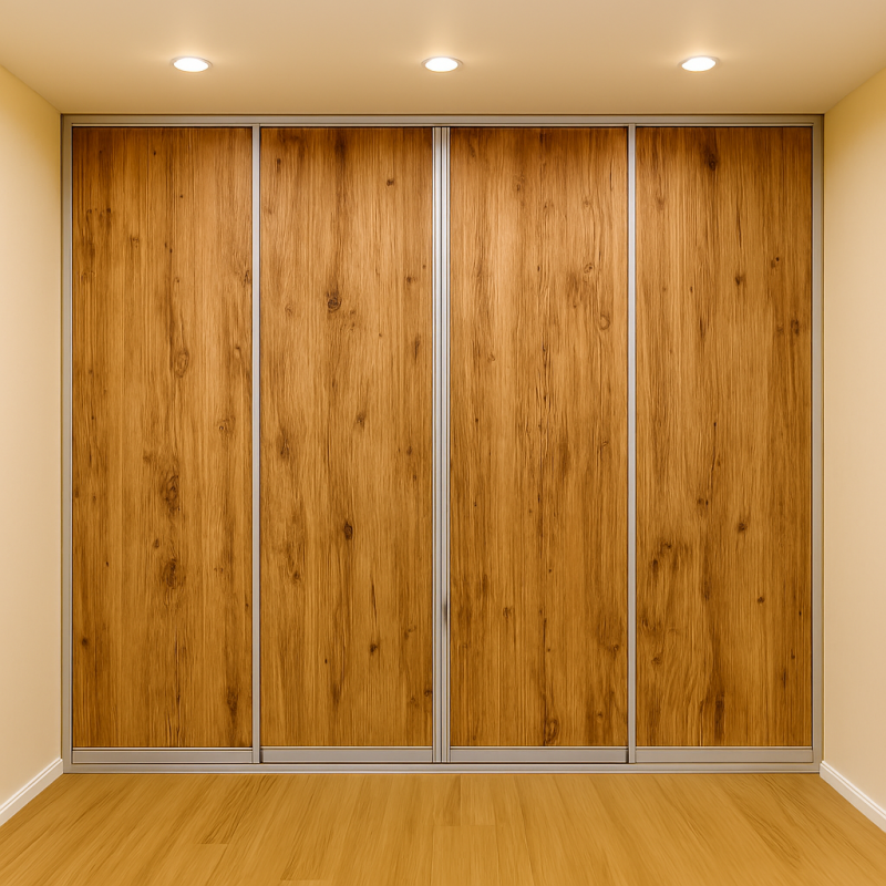Шкаф-купе «Модель 11» выполнен из ЛДСП с текстурой светлого дерева, оснащён четырьмя раздвижными дверями в алюминиевом профиле.