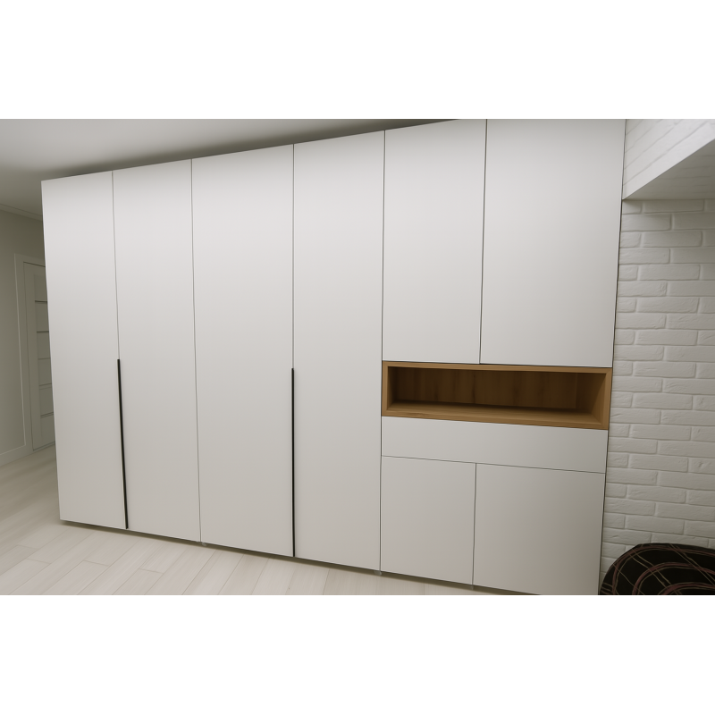 Современный шкаф для гостиной, выполненный в минималистичном стиле. Белые фасады без лишней фурнитуры создают чистую геометрию, а встроенная деревянная ниша добавляет тёплый акцент. Правая часть включает открытую полку и два нижних ящика — удобно для хранения документов, декора или техники. Чёрные вертикальные ручки на левых дверях подчёркивают графику и делают модель визуально сбалансированной.